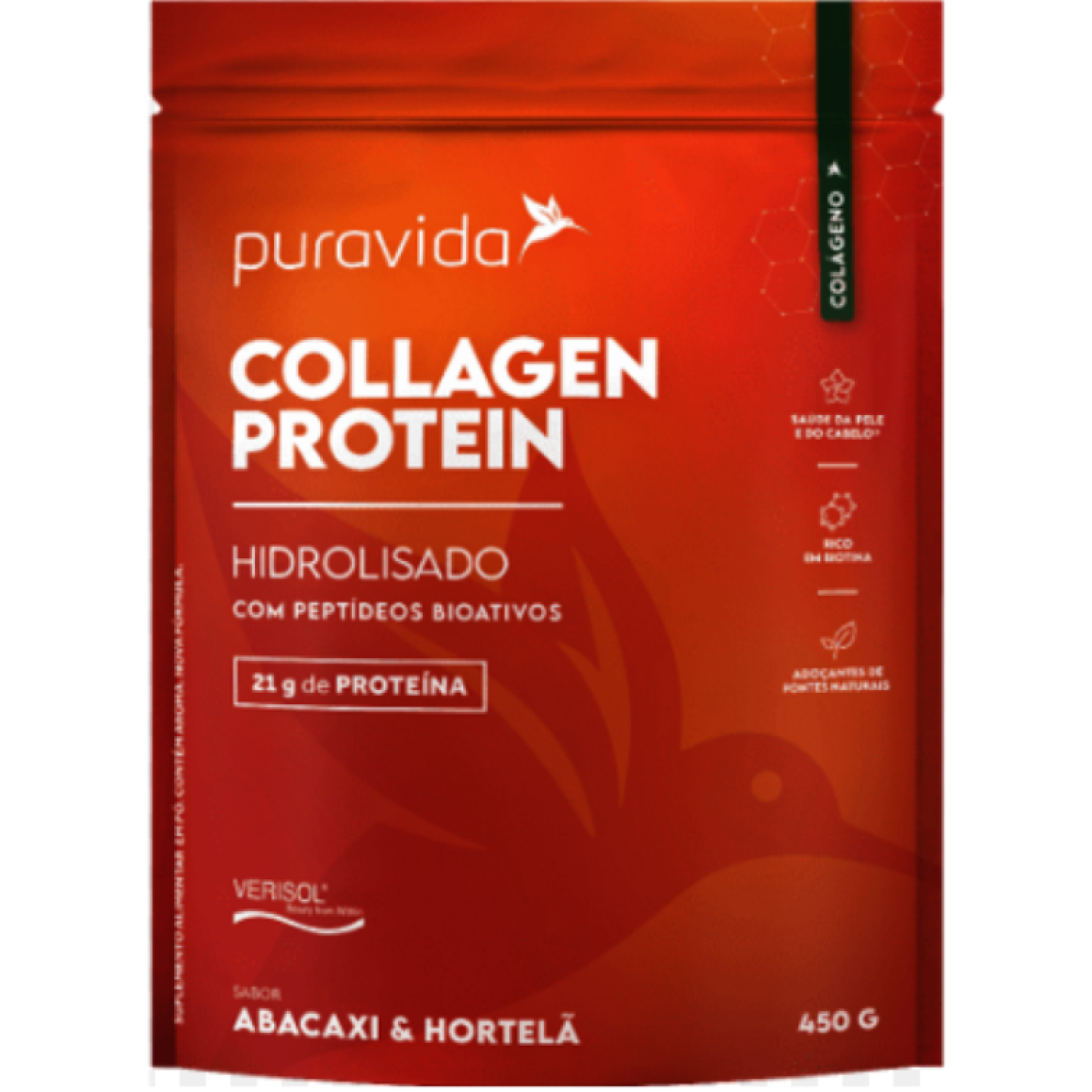 O Collagen protein sabor abacaxi com hortelã Pura Vida, é um blend de ingredientes naturais como o colágeno hidrolisado e o colágeno Verisol®, que são uma fonte de proteína de ótima biodisponibilidade.