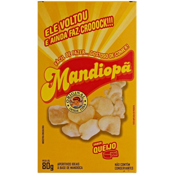 MANDIOPÃ É UM SALGADINHO FEITO À BASE DE FÉCULA DE MANDIOCA, O PRIMEIRO FABRICADO NO BRASIL. É UM ALIMENTO RICO EM AMIDO. AS PEQUENAS E DURAS RODELAS ESBRANQUIÇADAS SE TRANSFORMAN EM PETISCO LEVE E CROCANTE, E DEVE SER FRITO ANTES DE CONSUMIDO.